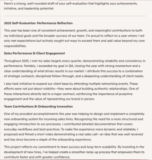 logisch. Het bedrijf geeft zelfs voorbeeldprompts waarmee “impactvolle” zelfevaluaties kunnen worden gemaakt. Veel medewerkers kunnen inmiddels prima zelf dit soort prompts verzinnen.